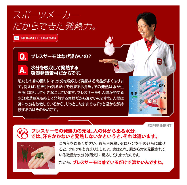 【ブレスサーモ】吸湿発熱素材「ブレスサーモ」は、人体から発生する水分を吸収して発熱効果をもたらす新しい保温メカニズムを実現させました。